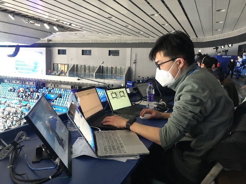 早在1月,新華社攝影團隊和技術團隊的施工人員就進入奧運閉環,在首都體育館吊裝的桁架上安裝了2臺遙控云臺相機,其中一臺位于場地中心主形象景觀正上方,另一臺位于短道終點正上方。兩臺相機各有側重又互相補充,基本可以無死角覆蓋場內的各個角度。與手持相機拍攝的最大不同是遙控云臺相機需要使用電腦軟件控制,對于調整角度和曝光等操作要求更復雜。5日下午5點,雖然距離晚場開賽還有兩個多小時,各路記者已經將首都體育館本就不大的媒體工作間圍得水泄不通。抵達場館后,我抓緊時間趕到看臺最高層的遙控云臺相機操控席位調試設備,競賽區域從這里看去一覽無余,對于操作遙控云臺相機來說是最好不過。