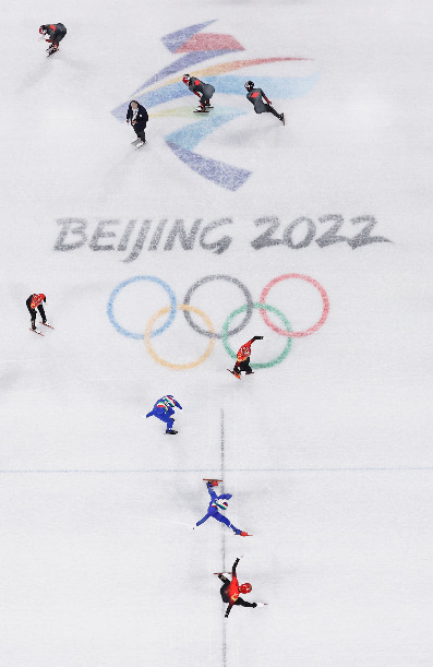 ↑2月5日,中國隊選手武大靖(下)在比賽中沖過終點。當日,北京2022年冬奧會短道速滑項目混合團體接力決賽在首都體育館舉行。新華社記者 徐子鑒 攝