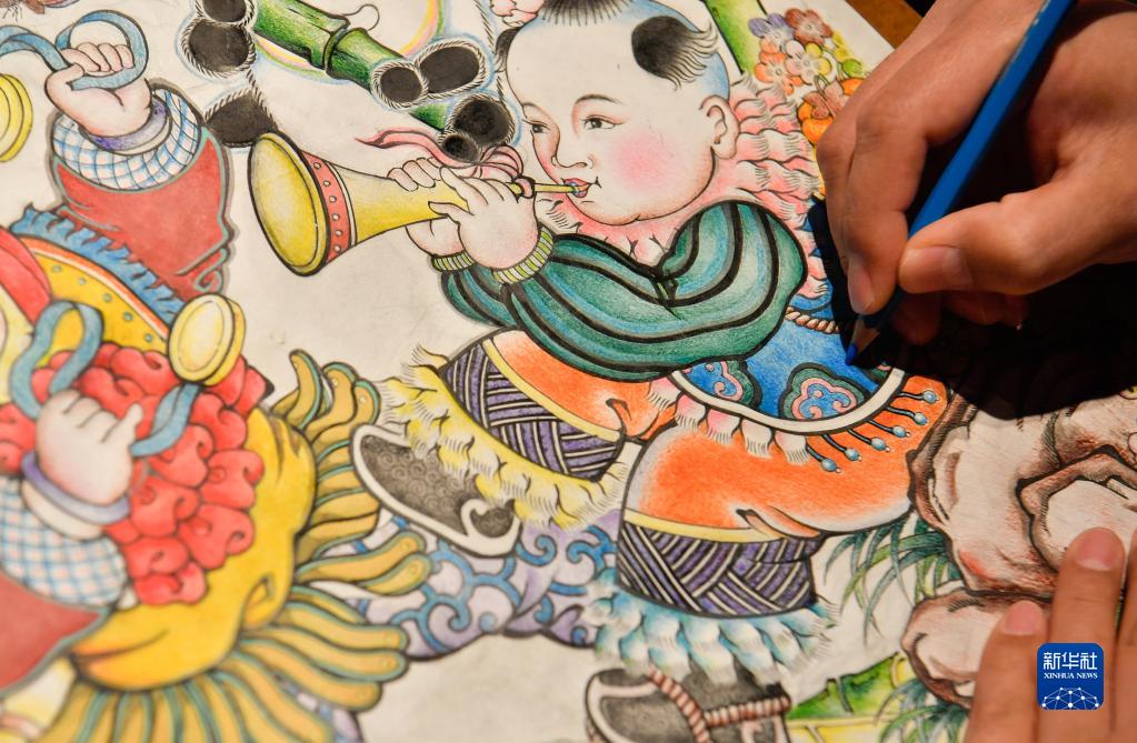 2月10日,天津楊柳青畫社青年傳承人在為其創作的年畫作品進行彩繪。