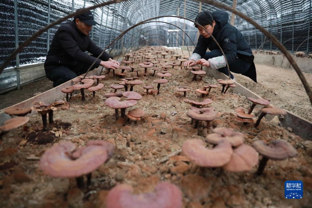 2月11日,在浙江省杭州市臨安區天目山鎮中草藥種植園內,工作人員對種植的靈芝進行管護。