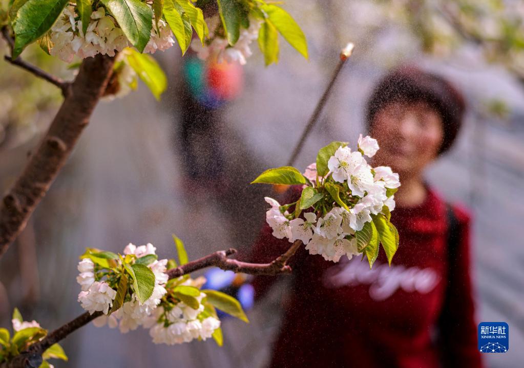 2月11日,在山東省榮成市上莊鎮尹家村光伏大棚內,種植戶為櫻桃花進行人工授粉。