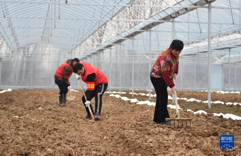 2月11日,在安徽省合肥市廬陽區(qū)大楊鎮(zhèn)十張村一農(nóng)業(yè)大棚,黨員志愿者幫助農(nóng)民進(jìn)行西瓜地開溝起壟。