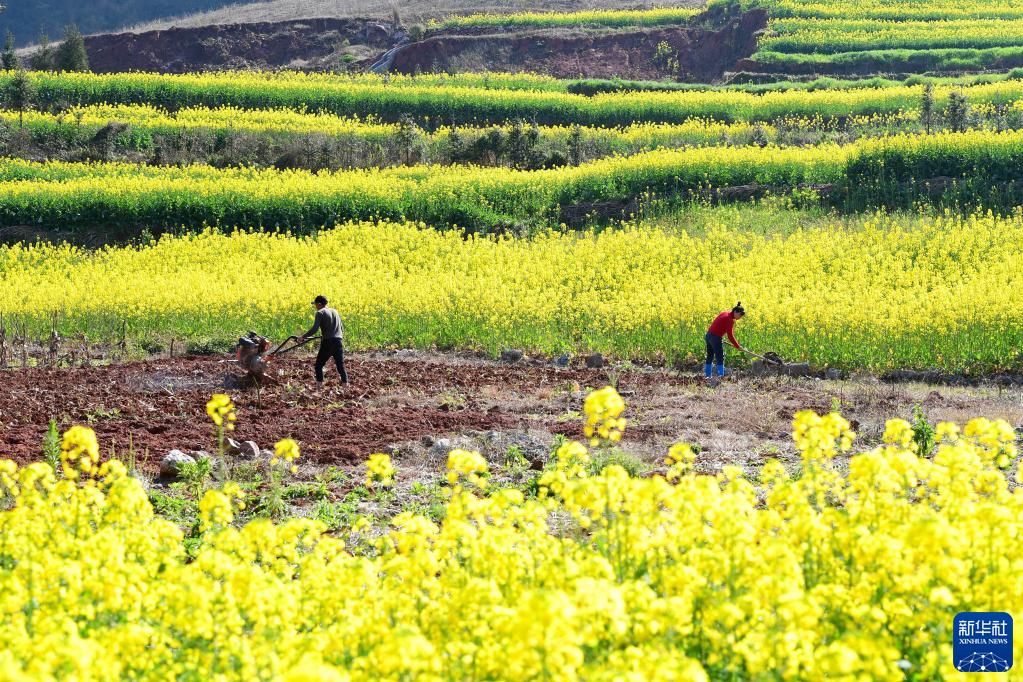 2月11日,云南省曲靖市羅平縣九龍街道拖區(qū)村的農(nóng)民在田間勞作。