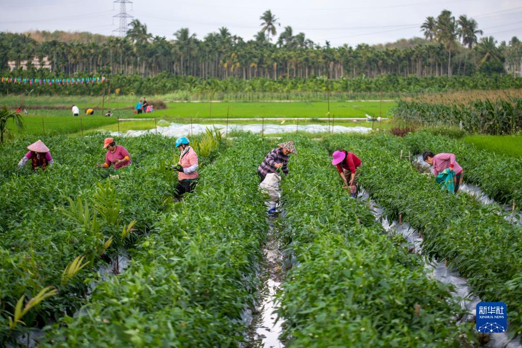 2月10日,海南省瓊海市嘉積鎮紅星社區的農民在采收辣椒。