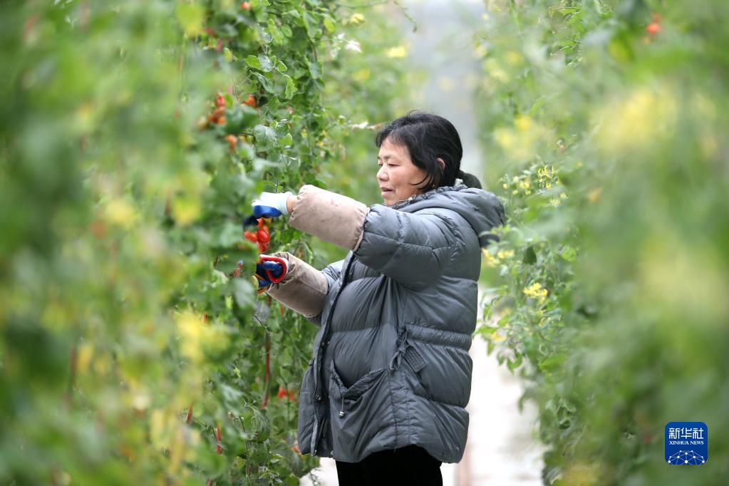 2月11日,浙江省東陽市南馬鎮花園村現代農業生態園員工在采摘水果番茄供應市場。
