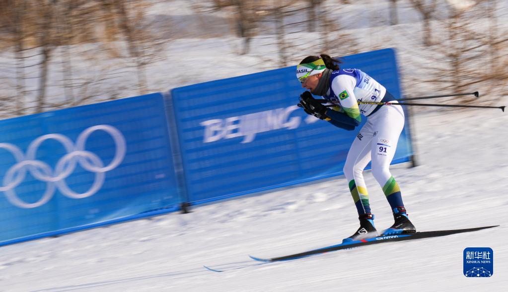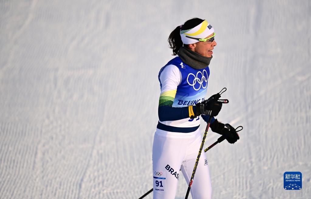 在北京冬奧會張家口賽區國家越野滑雪中心,雅克利娜·莫朗與巴西隊工作人員、隊友相互致意(2月10日攝)。新華社記者 張宏祥 攝
