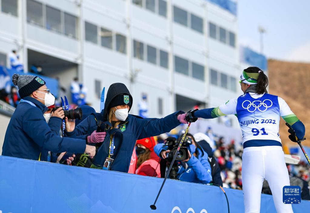 在北京冬奧會張家口賽區國家越野滑雪中心,雅克利娜·莫朗與巴西隊工作人員、隊友相互致意(2月10日攝)。新華社記者 胡虎虎 攝