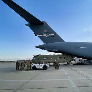 美國中央司令部司令肯尼思·麥肯齊2021年8月30日宣布,美軍已完成從阿富汗撤出的任務。這是當年8月28日一架CH-47運輸直升機在阿富汗喀布爾國際機場被裝載到C-17運輸機上。(新華社發)