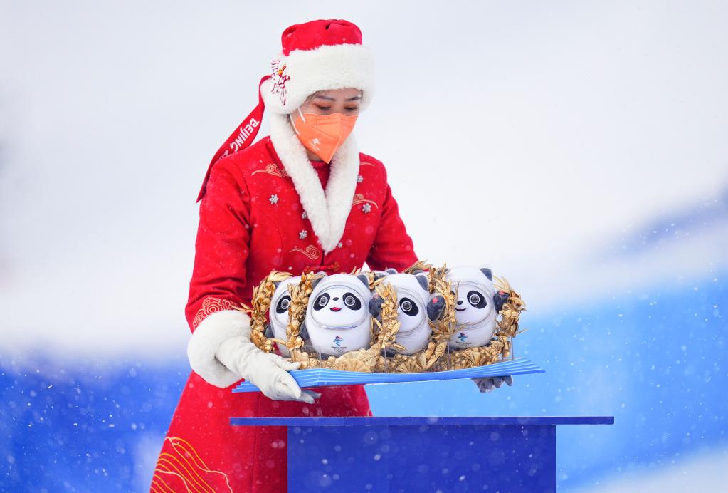 2月12日,紀念品頒發(fā)儀式工作人員擺放“冰墩墩”紀念品。新華社記者許暢攝