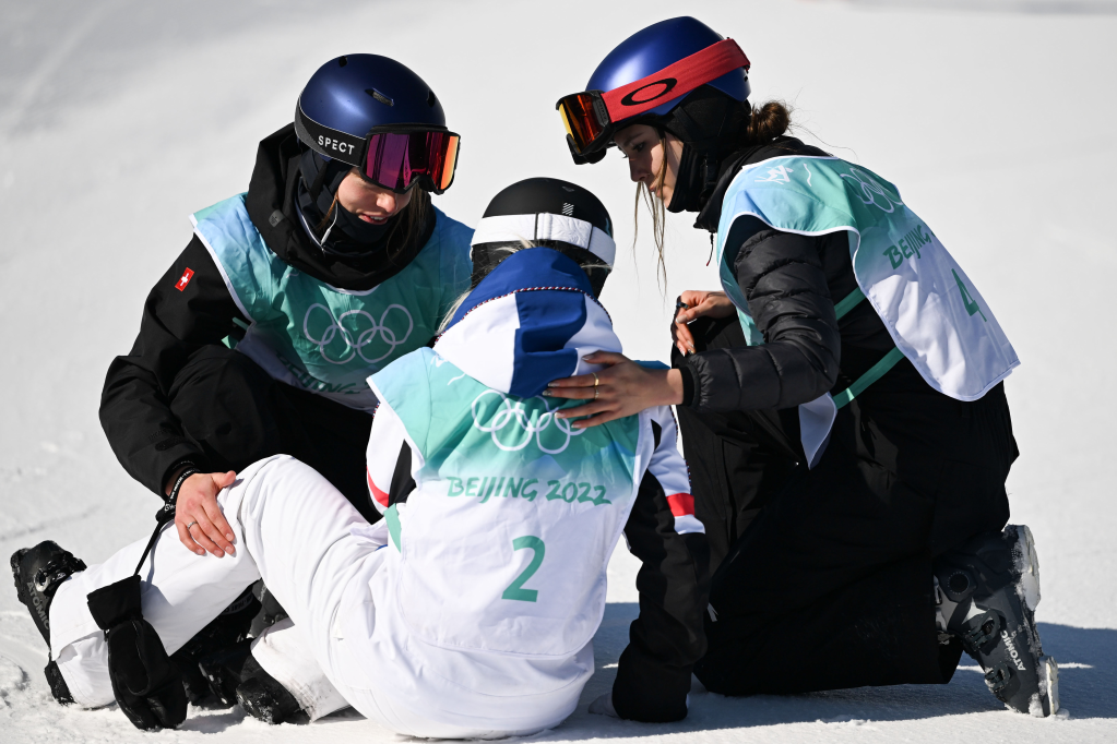 2月8日,谷愛凌(右)和瑞士選手瑪蒂爾德·格雷莫德(左)在比賽后安慰法國選手苔絲·勒德。新華社記者薛宇舸攝