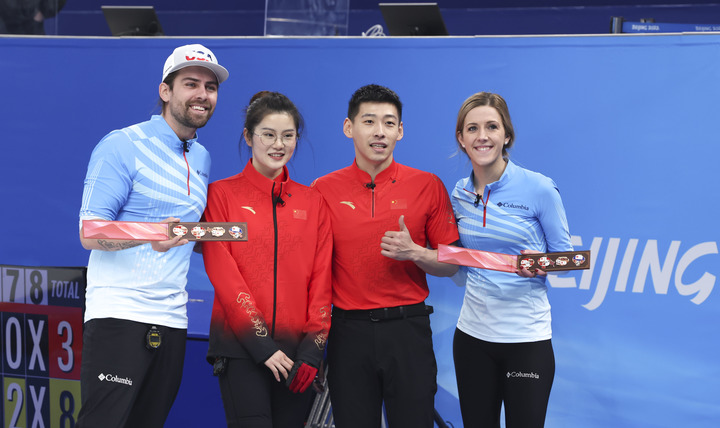 2月5日,中國隊選手范蘇圓(左二)、凌智(左三)與美國隊選手克里斯托弗·普利斯(左一)、維多利亞·珀辛格在賽后合影。新華社記者王婧嬙攝