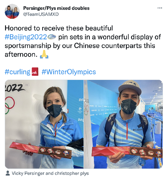 “冬奧朋友圈”展現出了中國選手與其他國家運動員惺惺相惜的珍貴友情。在冰壺混雙循環賽第八輪比賽中,中國冰壺混雙組合凌智和范蘇圓不敵美國組合維多利亞·珀辛格和克里斯托弗·普利斯。賽后,凌智和范蘇圓向對方贈送“冰墩墩”奧運紀念徽章,美國選手驚喜地接過禮物,四人合影留念。美國選手隨后在社交媒體賬戶上曬出收獲禮物的照片,并寫道:“非常榮幸收到這些精美的北京冬奧會徽章,我們的中國同行精彩地展現了體育精神。”美國隊員賽后在更衣室也向凌智和范蘇圓回贈了徽章。