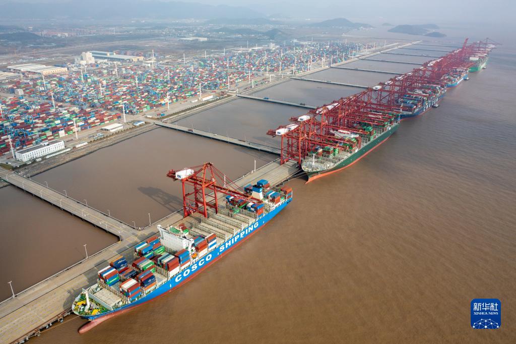虎年“雨水”節氣,寧波舟山港,塔吊林立,一片繁忙。