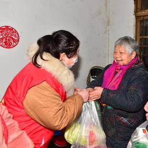 2月23日,在江西省南昌市東湖區董家窯街道青陽社區,志愿者為吳金蓮老人(中)送代購的藥品和蔬菜。