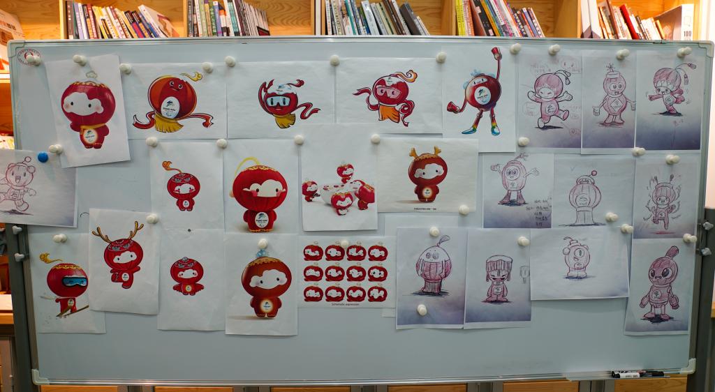 設(shè)計(jì)室內(nèi)的“雪容融”草稿圖。新華社記者 王帆 攝