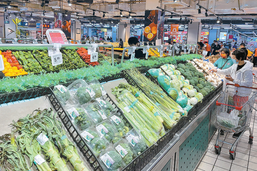 昨天(11日)傍晚,在物美大賣場玉蜓橋店,蔬菜、肉類、面包等生活必需品種類豐富、供應充足。 記者 鄧偉攝