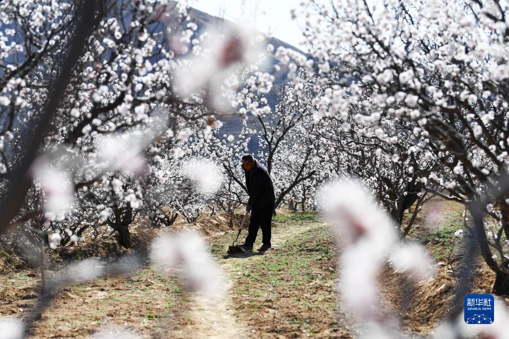 4月12日,農民在河北省張家口市懷來縣官廳鎮石片村杏花園里進行管護。