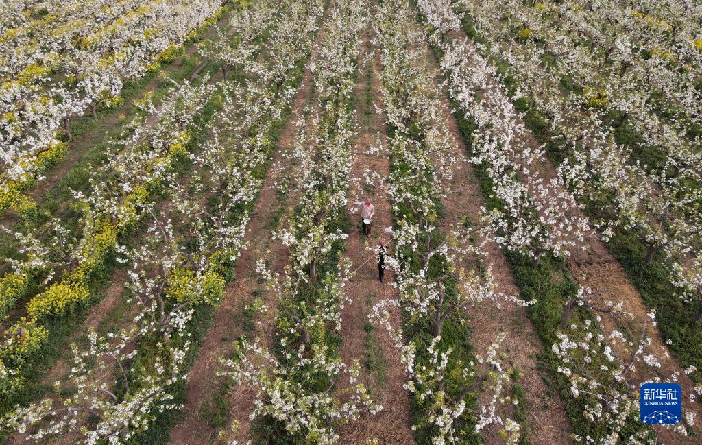 4月12日,河北省石家莊市深澤縣大橋頭鎮農民為梨花授粉(無人機照片)。