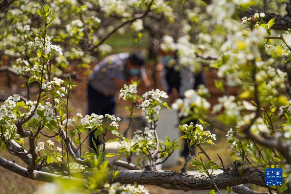 4月12日,河北唐山遵化市娘娘莊鄉(xiāng)一家養(yǎng)蜂專業(yè)合作社的農(nóng)民在梨樹果園忙碌。