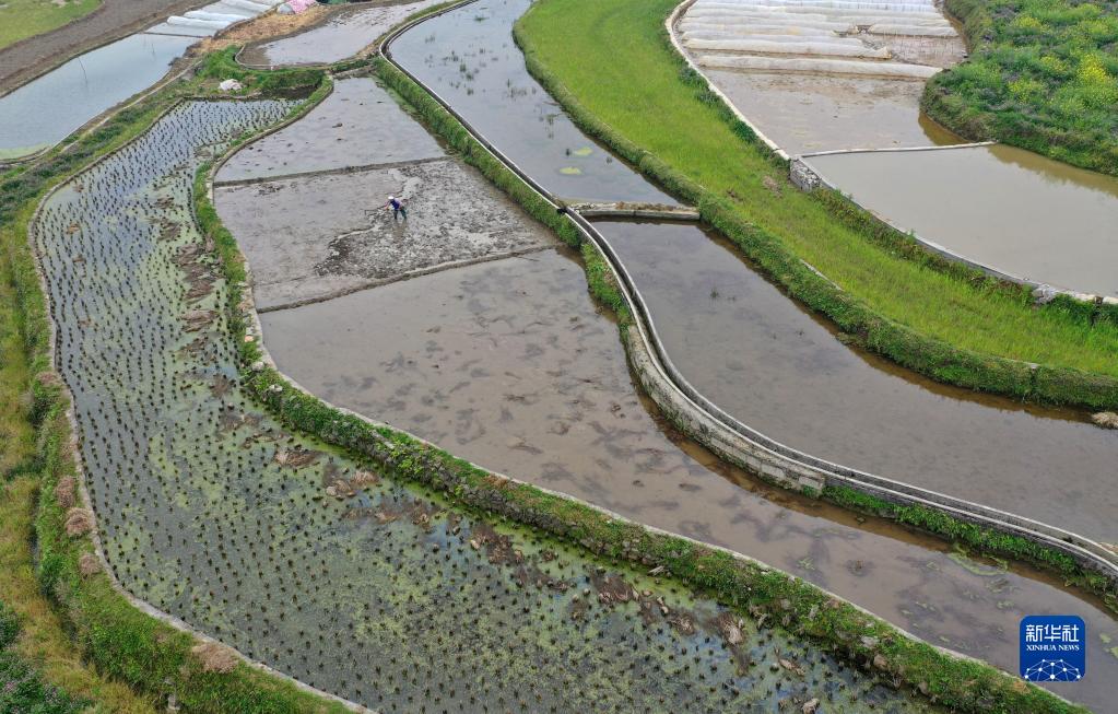 4月12日,村民在貴州省黔東南苗族侗族自治州丹寨縣揚武鎮長青社區整理水田(無人機照片)。