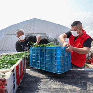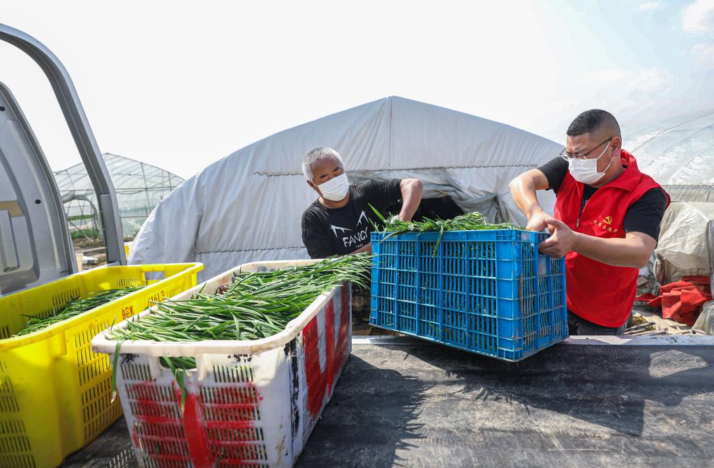 4月12日,在浙江省湖州市吳興區東林鎮青蕪農場,黨員志愿者與工作人員一起將新鮮蔬菜搬上貨車運往上海。新華社記者 徐昱 攝