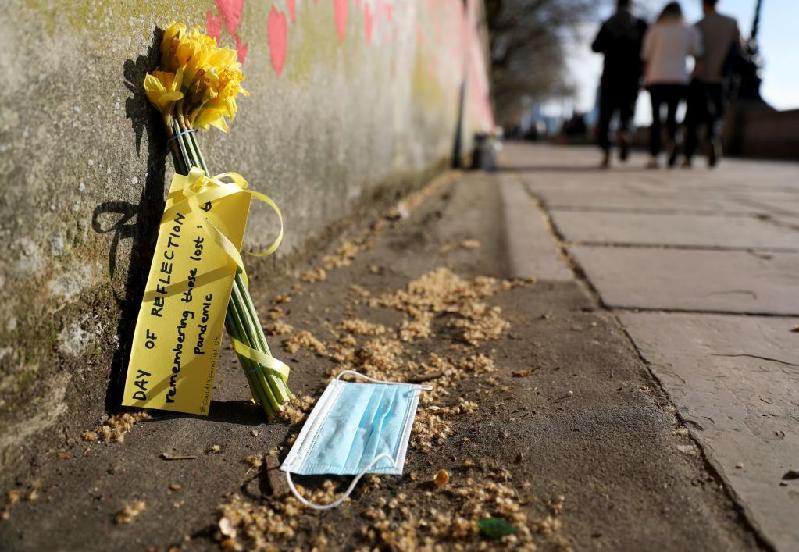 這是3月27日在英國倫敦國家新冠紀念墻邊拍攝的花束和口罩。花束旁的字條上寫著“紀念在疫情中失去生命的人們”。新華社記者李穎攝