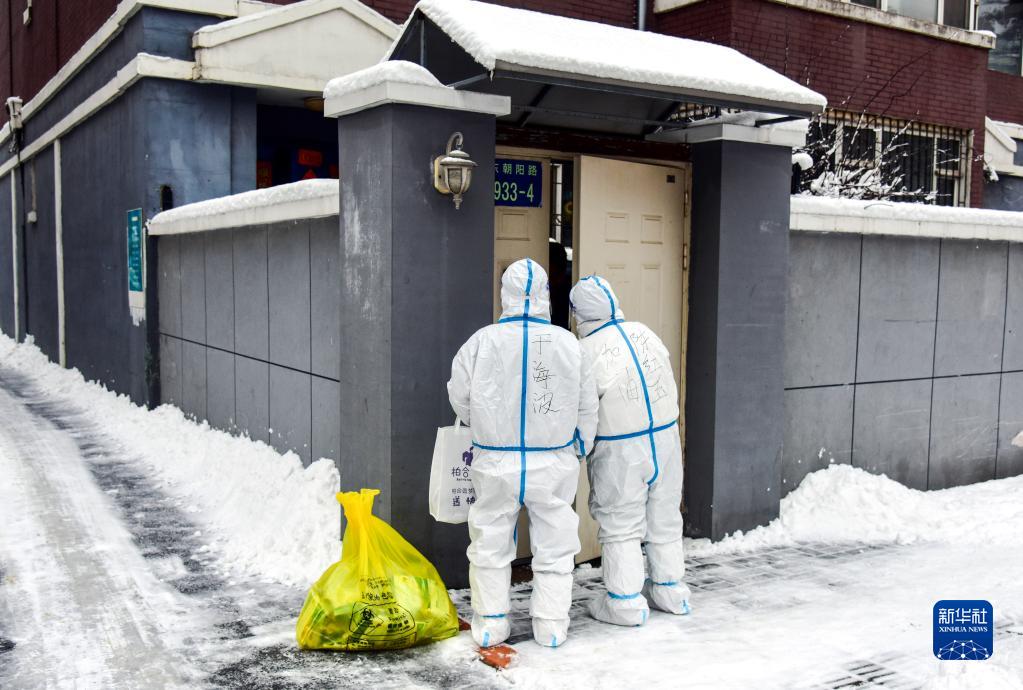 吉林省長(zhǎng)春市朝陽(yáng)區(qū)永昌街道社區(qū)工作人員挨門挨戶送“新冠病毒抗原自檢測(cè)試劑盒”(3月16日攝)。新華社記者 周長(zhǎng)慶 攝