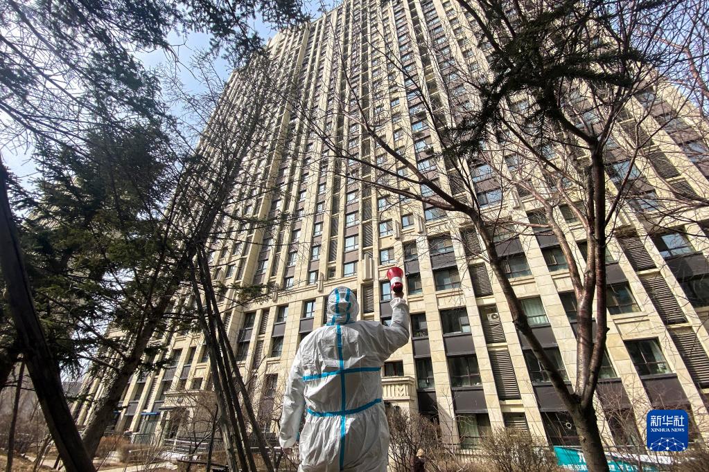 在吉林省長(zhǎng)春市一處管控小區(qū)內(nèi),防疫工作人員用喇叭提醒居民下樓接受核酸采樣(3月25日攝)。新華社記者 許暢 攝