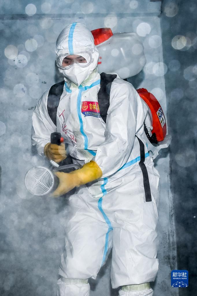 吉林省吉林市消防救援支隊(duì)黨員先鋒突擊隊(duì)隊(duì)員丁乾濤在居民樓內(nèi)進(jìn)行消殺作業(yè)(3月18日攝)。新華社記者 張楠 攝