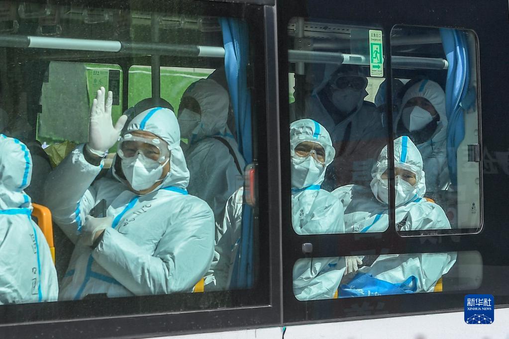 4月6日,在吉林省吉林市高新北區(qū)方艙醫(yī)院,出院患者朝車外招手致意。新華社記者 張楠 攝