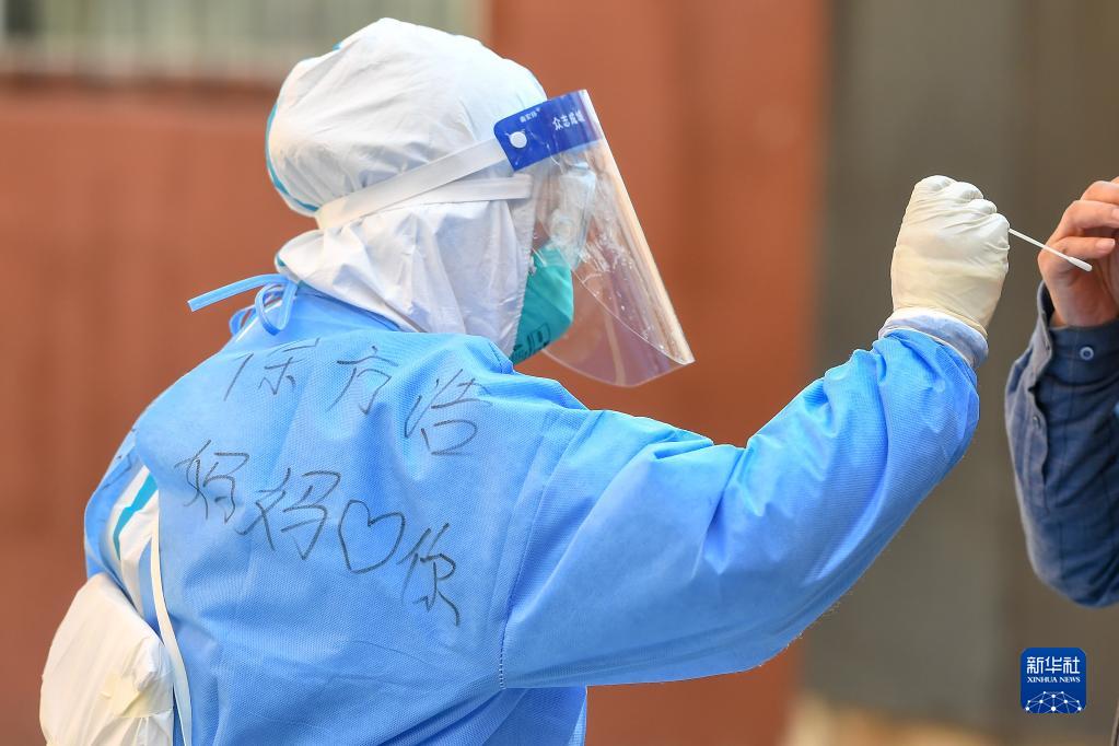 4月14日,在吉林省吉林市船營(yíng)區(qū)大東街道一核酸檢測(cè)采樣點(diǎn),工作人員為居民進(jìn)行核酸檢測(cè)采樣。新華社記者 張楠 攝