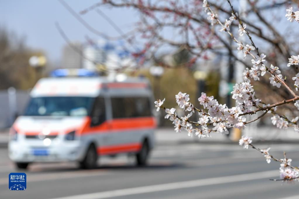 4月14日,一輛救護(hù)車在吉林省吉林市松江東路上駛過(guò),路邊桃花已經(jīng)盛開。新華社記者 張楠 攝