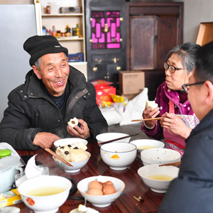 段村村民蔡文明(左)和家人在家中用早餐。(新華社記者柴婷攝)