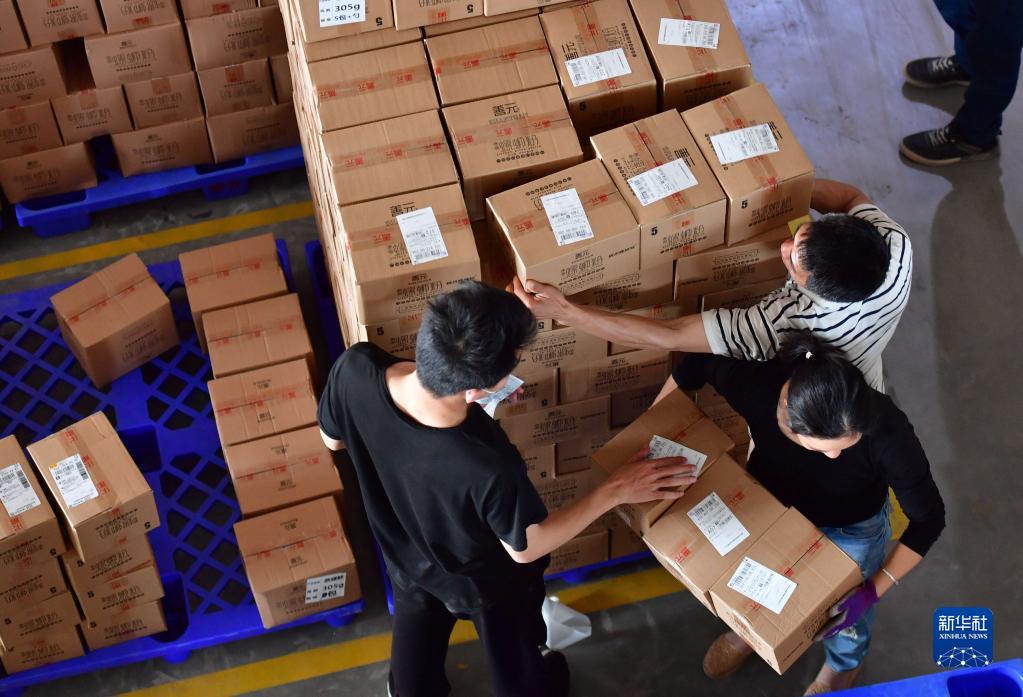 在廣西善元食品有限公司螺螄粉倉庫,工人將螺螄粉成品裝車,準備發往各地(4月11日攝)。新華社記者 黃孝邦 攝