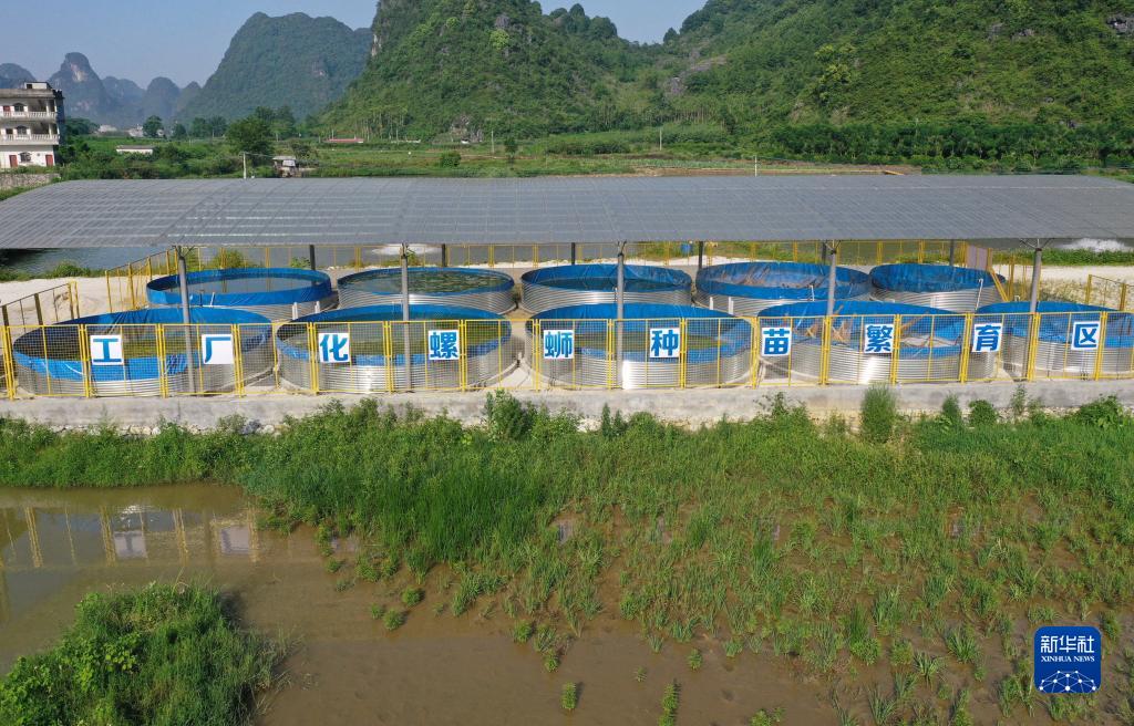 在柳州市柳江區里高鎮板六村螺螄養殖基地,技術人員在查看螺螄生長情況(2021年6月6日攝)。新華社記者 黃孝邦 攝