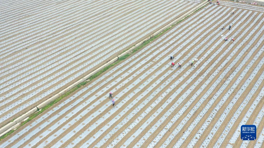 在柳州市魚峰區白沙鎮王眉村柳州螺螄粉原料產業基地,村民在種植辣椒(無人機照片,3月16日攝)。新華社記者 黃孝邦 攝