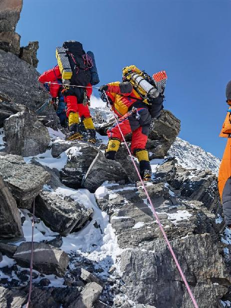 登山隊員們身著連體羽絨服