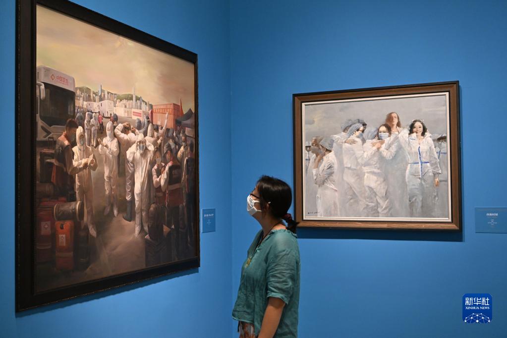 6月24日,參觀者在展覽上觀看作品《逆行出征 同心守護(hù)》。 新華社記者 李鑫 攝