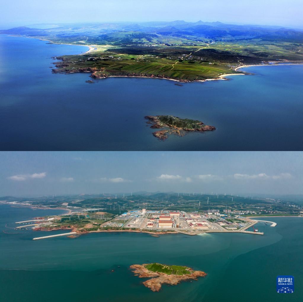 拼版照片:遼寧紅沿河核電站建成前(上)、全面投產后對比照片(上圖為2004年攝,下圖為2022年6月攝)。
