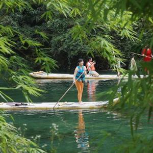 7月16日,游客在湖北省宜昌市秭歸縣三峽竹海生態景區體驗竹筏親水項目。