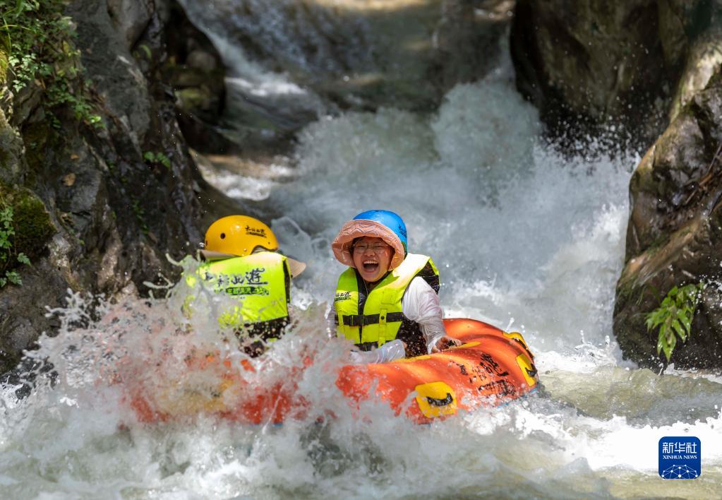 7月16日,游客在貴州省黔西市中建鄉體驗漂流。