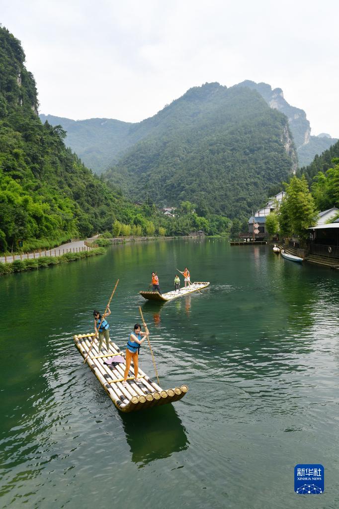 7月16日,游客在湖北省宜昌市秭歸縣三峽竹海生態(tài)景區(qū)體驗竹筏親水項目。