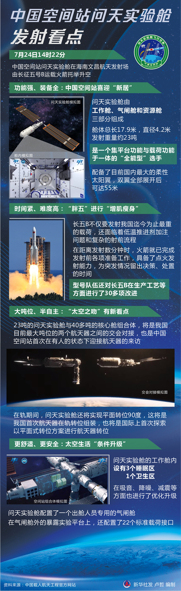 新華社北京7月24日電? 題:中國(guó)空間站問(wèn)天實(shí)驗(yàn)艙發(fā)射看點(diǎn)