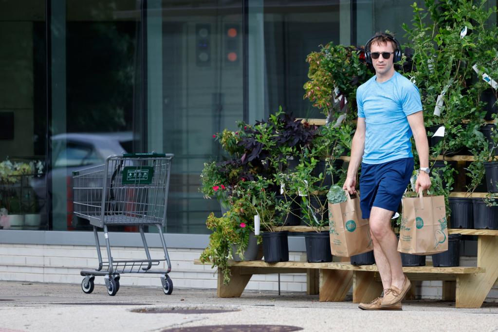 6月14日,在美國華盛頓,一名男子提著購物袋從一家食品超市旁走過。(新華社發,沈霆攝)