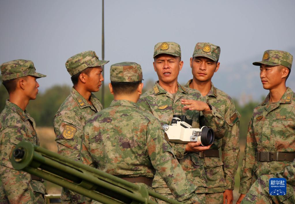 第73集團軍某旅合成營營長陳松(中)與技術骨干探討革新器材使用情況(7月27日攝)。新華社記者 張永進 攝