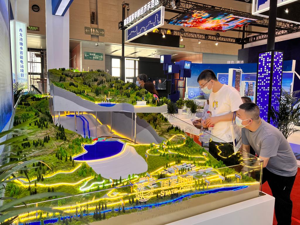 在博覽會上,一個“超級充電寶”的沙盤模型演示了電站如何在用電低谷時將風力和光伏富余的電把水抽到高處、轉化為勢能,待電網高峰負荷時再放水回到下水庫進行發電的過程。這就是位于山西省五臺縣的西龍池抽水蓄能電站。