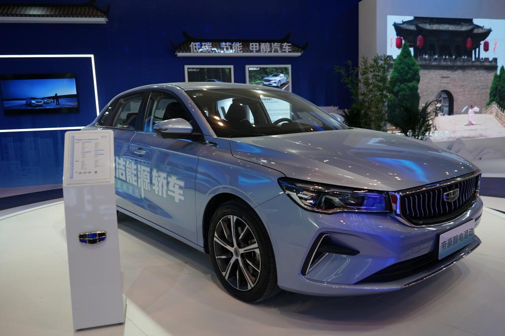 在博覽會上,一輛藍色吉利醇電混動轎車引來眾人關注和試乘,駕駛艙內科技感十足。據工作人員介紹,這輛車以甲醇作為燃料,二氧化碳排放比傳統燃油車減少約26%,而且甲醇燃料便宜,每公里出行成本僅0.3元。