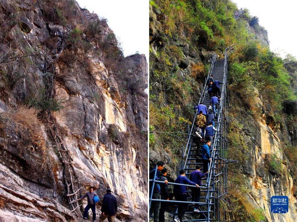 拼版照片:左圖為2013年2月22日拍攝的四川省涼山彝族自治州昭覺縣“懸崖村”阿土勒爾村的藤梯;右圖為2016年11月29日,在四川省涼山彝族自治州昭覺縣,人們沿著剛建好的鋼梯登上“懸崖村”。新華社發(阿克鳩射 攝)
