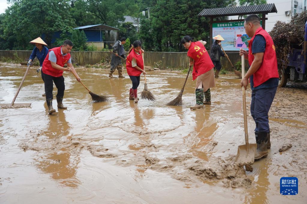 2022年6月21日,在江西省德興市泗洲鎮張家畈社區,黨員干部在清理淤泥和垃圾。新華社記者 周密 攝