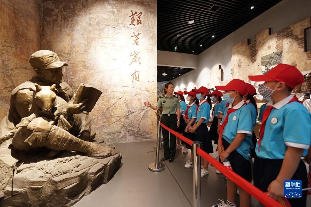 2021年5月30日,在位于河北省邢臺市信都區漿水鎮的中國人民抗日軍政大學陳列館,工作人員向小學生們講述抗大歷史。新華社記者 牟宇 攝